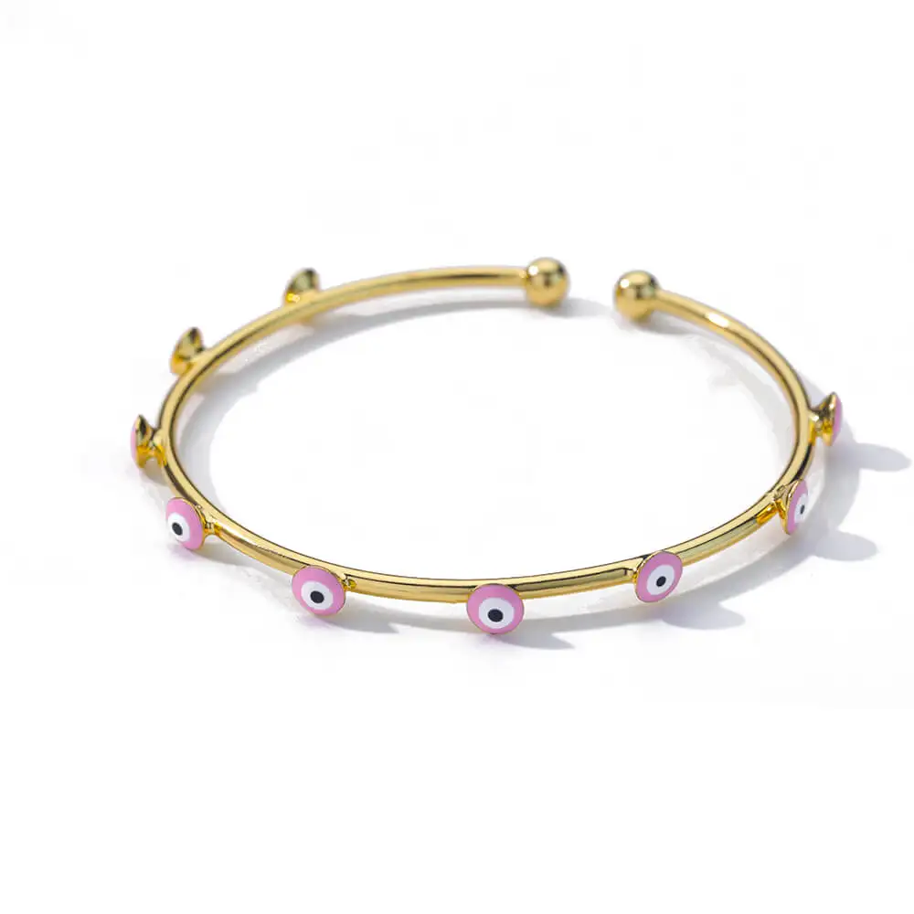 The bracelet features a unique open bangle design adorned with a captivating Evil Eye charm, delicately set in a bezel setting.