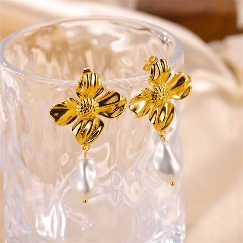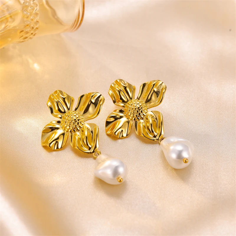 Steel Flower Pearl Earrings Plated Earrings 18K Gold